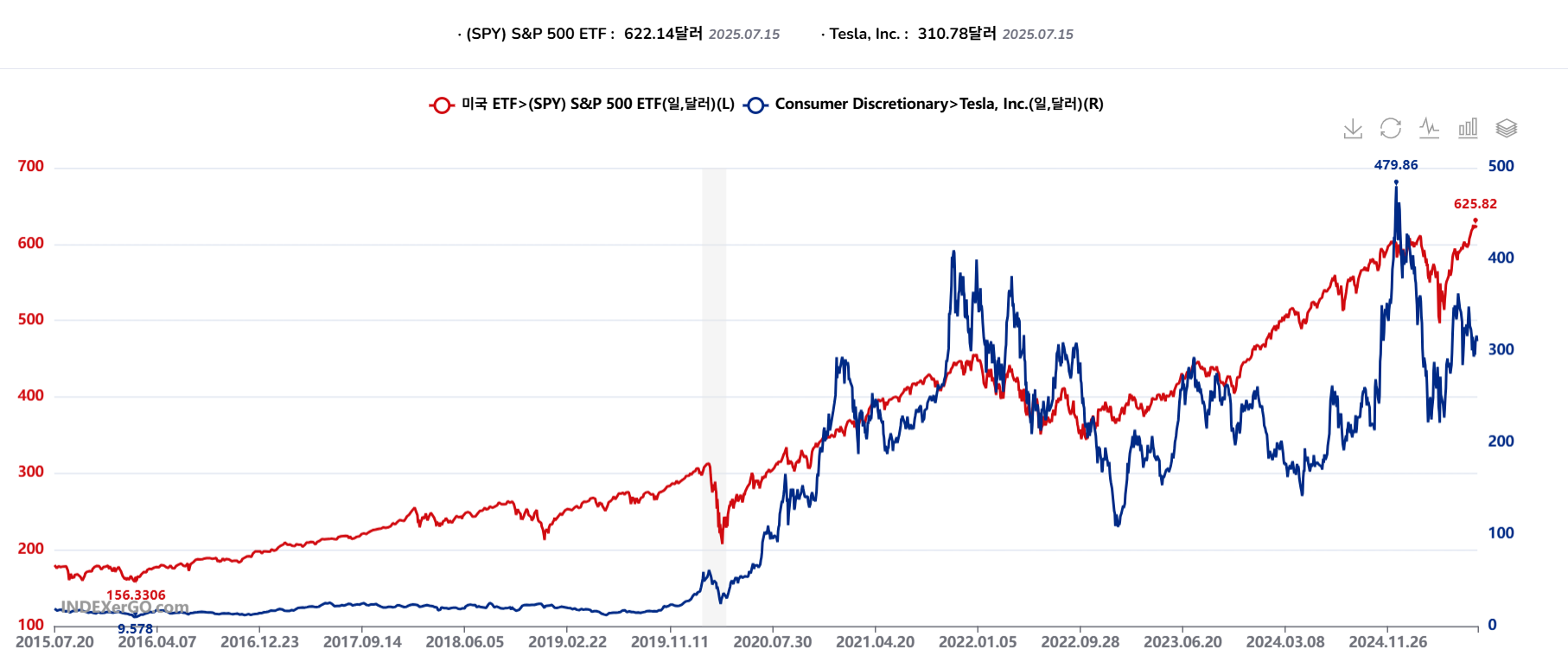 SPY ETF(빨간색) 와 TSLA 중목(파란색) 주가 변동 비교