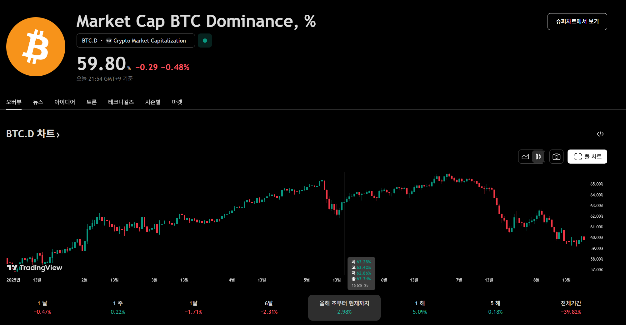 저는 주로 트레이딩뷰(TradingView)와 같은 공신력 있는 사이트에서 비트코인 도미넌스 차트(티커: BTC.D)를 확인합니다.